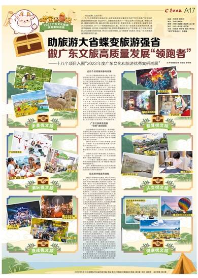 5·19中国旅游日来临之际,由羊城晚报报业集团主办的“2023年度广东文化和旅游优秀案例巡展”也迎来令人欣喜的收获季节——经过近两个月的征集、考察和调研,涵盖乡美悦文旅、潮玩悦文旅、夜炫悦文旅、智慧悦文旅、人文悦文旅、健康悦文旅六大文旅板块,共十八个优秀案例成功入围。他们作为广东优秀文旅案例的代表,通过羊城晚报、金羊网、羊城派客户端、视频号等融媒体平台广泛传播,全方位展示各自的文化底蕴与创新思路,突出行业领先色彩,以“领跑者”的姿态,彰显广东文旅高质量发展的新锐力量。