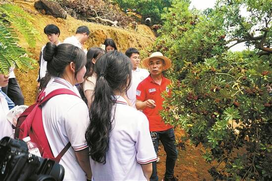 在景光村杨梅种植基地,普宁市黄埔职业技术学校的师生正围在农户杨惠潮的周围,听他讲解杨梅的历史文化和种植、采摘过程,并亲身体验采摘杨梅的乐趣。