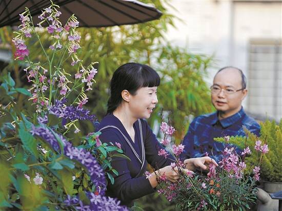 去年,他在家旁边租了一座有天井的老屋,专门给妻子当工作室,妻子在天台上种满了花