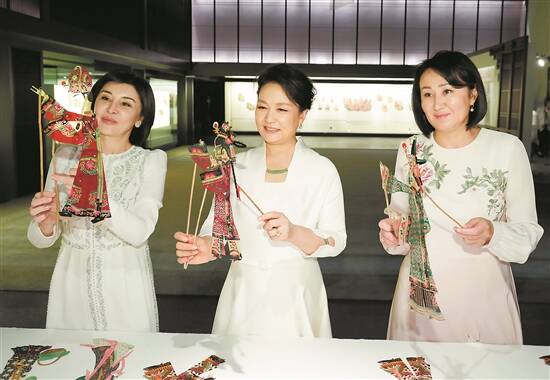 在易俗社展示厅,彭丽媛同来宾们体验皮影制作技艺,她们被色彩丰富、造型生动、工艺精湛的皮影人物所吸引,兴致勃勃地为皮影人物上色点彩。在观看皮影戏表演后,彭丽媛和来宾们来到幕后,和老艺人们亲切交谈。经过庭院时,小学员们正练习唱秦腔、走台步。他们兴高采烈地围拢上来,争相展示自己的唱功。彭丽媛鼓励他们成为弘扬中华戏曲文化艺术的接班人。