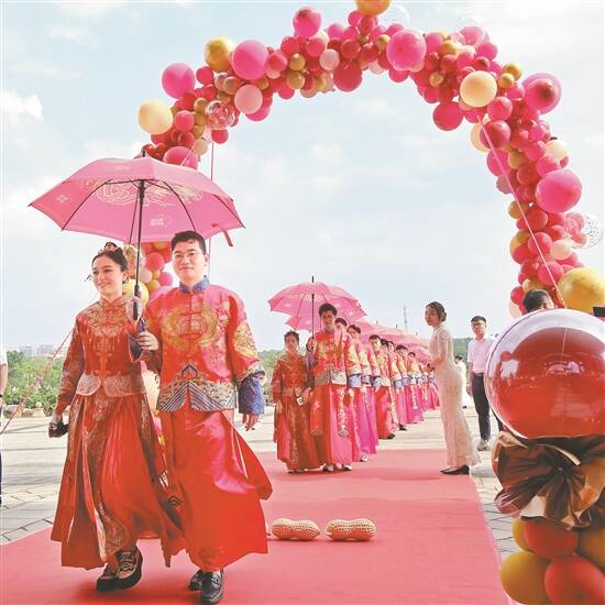 5月20日,广铁集团广州动车段举办了“粤动佳人·琴瑟百年”职工集体中式婚礼,20对新人在单位“娘家人”和亲朋好友的见证下,心手相牵步入婚姻殿堂 羊城晚报记者 李志文 通讯员 陈伟俊 龙鲲鹏 张晓敏 摄