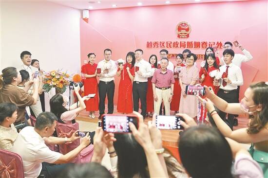 因“520”谐音“我爱你”,不少市民选择在5月20日办理结婚登记。记者从广东省民政厅获悉,5月20日广东迎来婚姻登记小高峰,全省多地婚姻登记部门为爱加班,共办理结婚登记12450对,其中办理“跨省通办”结婚登记1813对。 详见A4