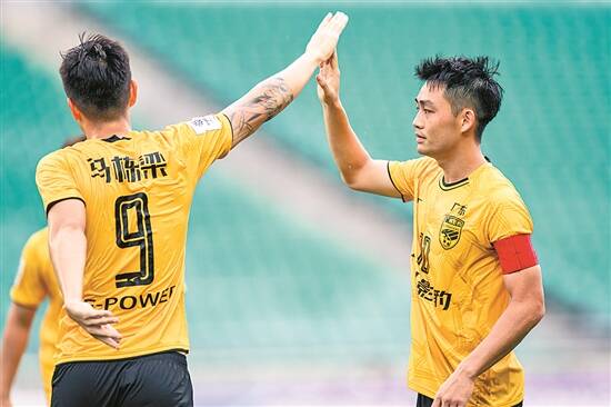 广州影豹球员马栋梁(左)与队友庆祝进球 羊城晚报记者 钟振彬 摄
