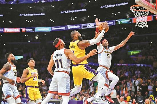 湖人队球员詹姆斯(右二)在比赛中上篮 新华社发