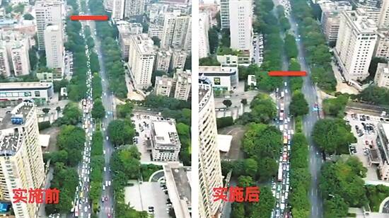 增设直行待行区前后,广州大道排队情况对比 通讯员供图