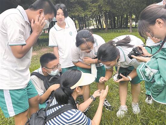 《生态观察与写作》是113中学2022学年开设的一门特色课程,任课老师是来自高一年级的语文老师赵艳华。谈起开设这门课的初衷,赵艳华表示,自己本身就是一个“自然爱好者”,“平日里就喜欢去观鸟,去公园里观察生物,在自然里是最能得到放松的。”而作为身处一线的教育工作者,学生们的活动范围若仅仅困于校园和家庭之中,很难将压力释放出去。于是,结合自己的兴趣爱好和育人目标,赵艳华制定了一系列的课程内容,例如观察草地生物,必须要在自己的带领和判断下才能接触,而跨学科学习也在课堂中有所体现。