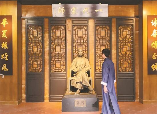 咏春拳传承人董崇华在叶问雕像前驻足 陈贤宇 摄影