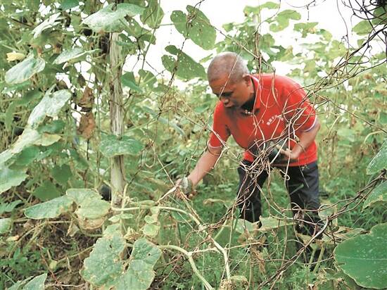 羊城晚报讯 记者戴灵敏、通讯员李柳枝报道:5月21日,在阳江阳春市三甲镇大垌村豇豆种植示范基地,管理基地的黄永强一大早就忙活开了,有收购商订购了5000多公斤贝贝南瓜,将于当天下午4点多来收货。他得抓紧组织工人在运输车到来前将额定数量的南瓜采摘下来。