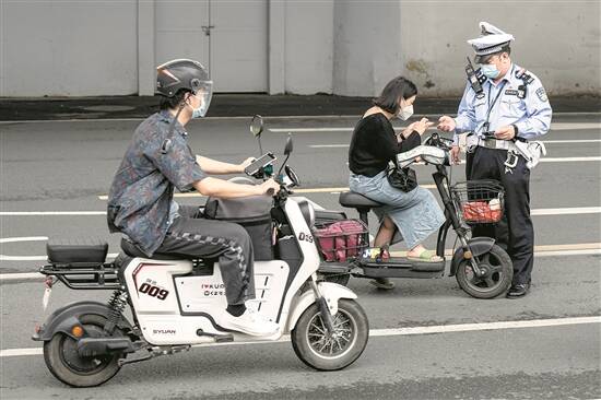 此外,违规载人的情况也非个案。执法过程中,一中年男子驾驶电动自行车载着另一名成年男性,被交警拦下。接受了警告处罚和安全教育后,该中年男子表示:“我搭载的是朋友,图个方便,但没意识到危险。通过民警的安全教育,我知道了电动自行车不能搭载成人,下次不会再这样做了。”