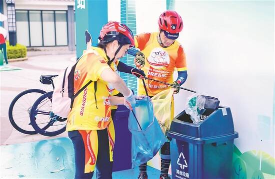 在垃圾分类主题骑行活动中,市民边骑行边收集沿街垃圾