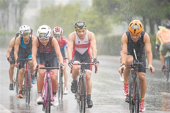铁人三项选手冒雨骑行(资料图) 主办方供图