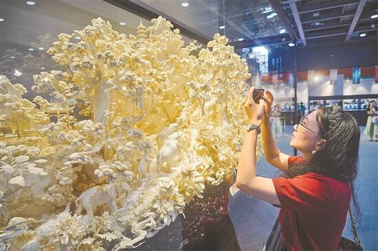 观众在拍摄牙雕国家级代表性传承人张民辉参评山花奖的作品《万象更新》