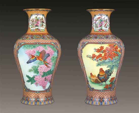 广彩代表性传承人周承杰以《欢祥和美》参评山花奖,这是以一对高63.8cm的花瓶为创作器形的广彩作品,以广彩吉祥花鸟、传统元素为主题内容,加以广彩色彩热烈和洗染技法,唱传欣欣向荣之气象。