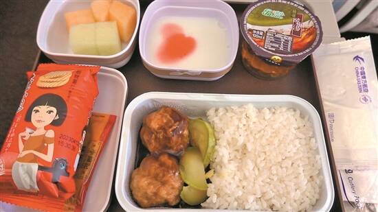 MU9192班次经济舱餐食种类丰富,主食为狮子头米饭,搭配水果拼盘、特色布丁、薯片零食、酸梅汤等 羊城晚报记者 黄颖琳 摄