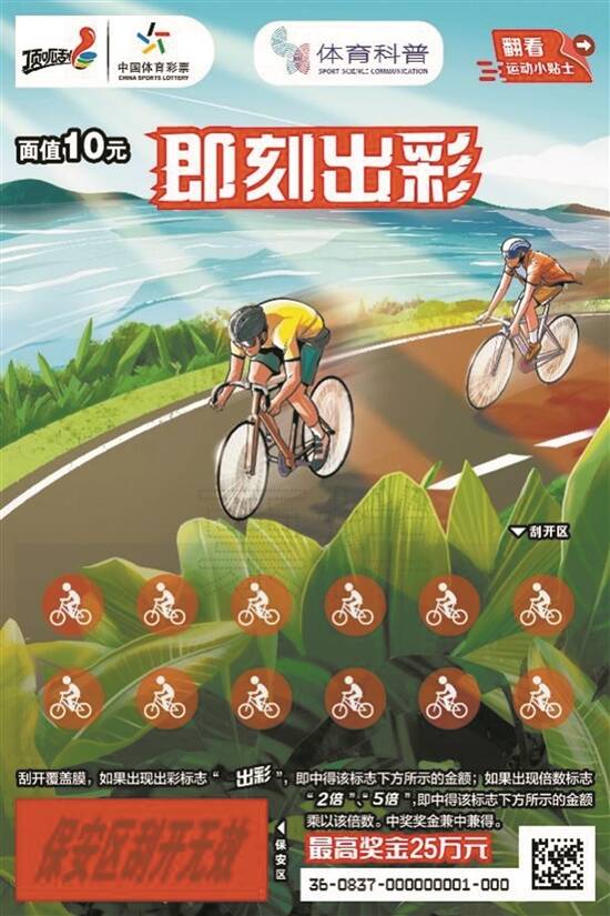 “体育科普 即刻出彩”体育主题即开票,面值10元,最高奖金25万元,游戏采用“找中奖符号”的玩法。