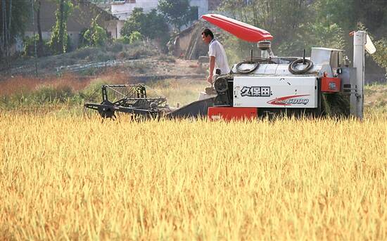 农民在收割金黄色的稻谷