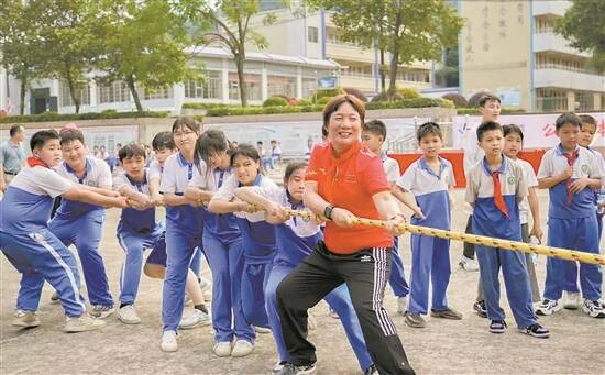 梁三妹分享了自己用青春和汗水铸就梦想的励志故事,弘扬体育精神,并与同学们进行互动问答,助力孩子们点亮理想灯塔,更与同学们组队参加花样拔河比赛,传递奋斗力量。