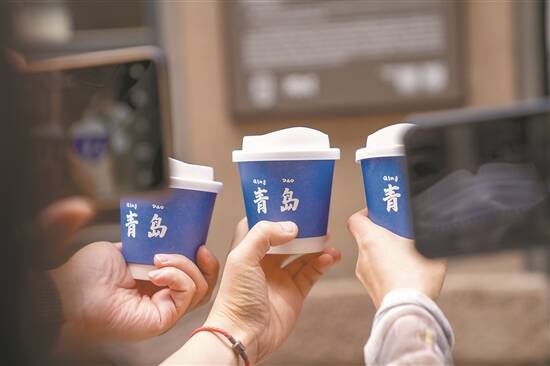 三江里的时尚茶饮打上“青岛”字样,吸引游客拍照打卡