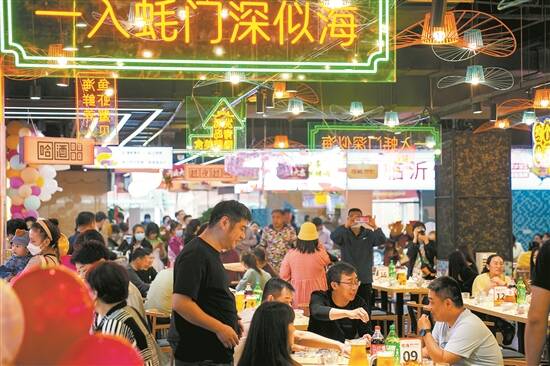 浮山所市集里的海鲜大排档开业,吸引了众多市民前来体验