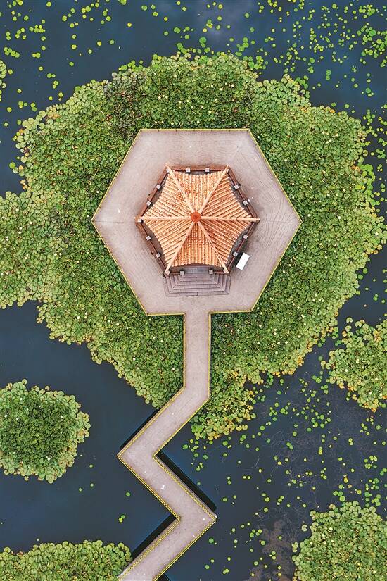 中山公园小西湖的湖心亭,经曲桥与岸边相连