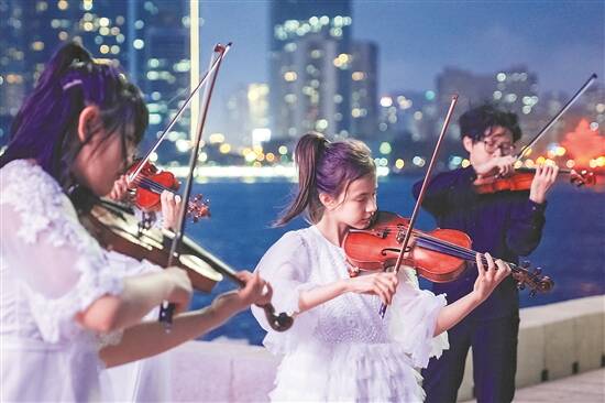 优美的乐声在情人坝上奏响,飘扬在浮山湾上