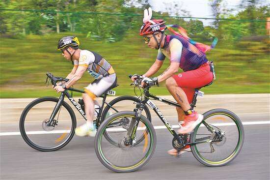 3日,2023粤港澳大湾区铁人三项赛在广州市增城区荔湖生态圈举行。赛事共吸引来自21个省区市共800余名选手报名。在比赛现场,羊城晚报记者发现了不少“亮点”选手。