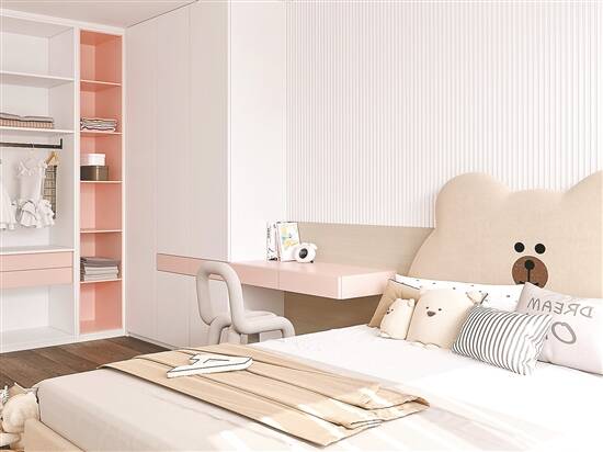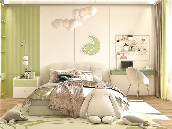 谢英凯:安全和环保在儿童房设计中至关重要。安全方面,儿童房装修要注意细节,比如桌椅的设计尽量不要出现棱角,可采用弧线角收边;插座要选择孩子够不到的高度,做好防电措施;抽屉开关设计要避免小孩夹手等等。环保方面,不仅家具要选用健康环保的材料,墙面地板都尽量从原材料上0醛处理。