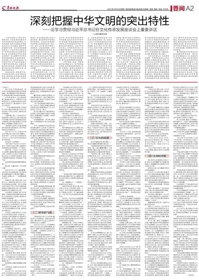 “只有全面深入了解中华文明的历史,才能更有效地推动中华优秀传统文化创造性转化、创新性发展,更有力地推进中国特色社会主义文化建设,建设中华民族现代文明。”在文化传承发展座谈会上,习近平总书记深刻指出“中华优秀传统文化有很多重要元素,共同塑造出中华文明的突出特性”,深入阐释中华文明具有突出的连续性、突出的创新性、突出的统一性、突出的包容性、突出的和平性,对于我们全面深入了解中华文明的历史,更好担负起新的文化使命,共同努力创造属于我们这个时代的新文化,具有重大指导意义。