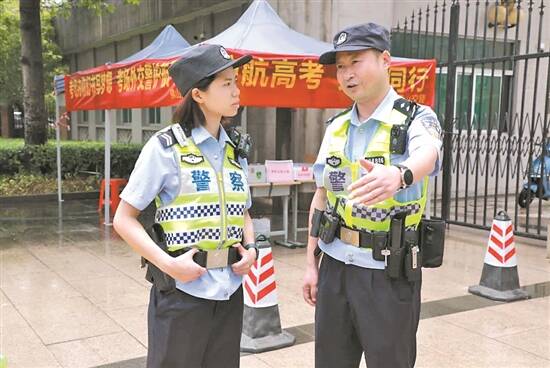 “这些高考应急包要提前摆好”“提前拉好警戒线,锥形筒要摆好,做好人流导控”“要留意陪考家长的状态,天气太热,身体容易出现不适”……校门口,赵方明带着陈芷岚跑前跑后,传授着护考经验,手上的动作也没停着,从警务便民车上拿来高考应急药箱、备用包、锥形筒等一一摆好,看到有家长送考生前来,又赶紧迎上去疏导指挥车辆、行人有序通行,提醒家长谨慎小心驾驶,确保场外秩序井然。没多久,两人身上的警服就被汗水打湿。