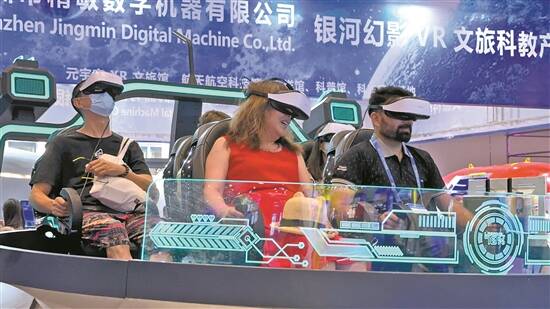 第十九届文博会昨日开幕,观众在现场体验VR设备“星际飞碟”