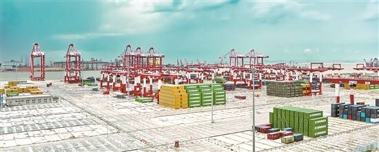 万吨货轮停靠在码头边,巨大的桥吊呼啸往返,将各式集装箱精准抓取,放置在一辆辆导引车上……作业区现场一派繁忙景象。