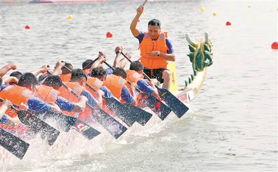 当天上午8时许,各队龙舟运动员准备就绪,蓄势待发。鼓号一响,龙舟上两排人马齐心协力奋力划桨击水,争先恐后破浪向前。飞溅的浪花、飞舞的龙旗、飞驰的龙舟,与岸上欢乐的人群构成一道亮丽的龙舟竞渡风景线。