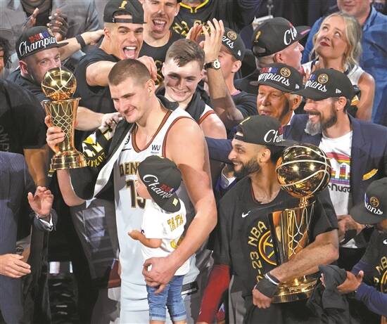 NBA2022-2023赛季总决赛在丹佛掘金主场波尔中心落下帷幕,掘金成功顶住迈阿密热火的绝地反扑,以94比89赢得总决赛的第四场胜利,最终以大比分4比1夺得队史首冠,当家球星约基奇当选FMVP(总决赛最有价值球员)。