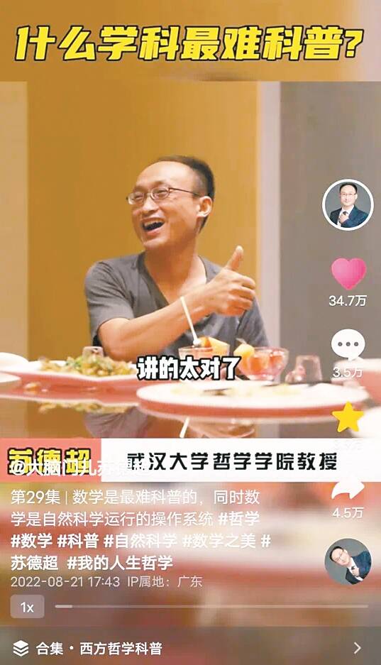 “宽宽的肩膀柏拉图,大大的脑门苏德超”,这是武汉大学哲学系教授苏德超的抖音账号简介。柏拉图的本名是亚利斯多克勒斯(Aristokles),由于他身体很健壮,所以被叫作宽肩膀;苏德超也经常被称为“大脑门”,他觉得自己的这个外号和这位大哲学家有“异曲同工”之处。“之前我很抗拒这一点,觉得自己头发长得少了才被这样叫,后来觉得挺好,我也接受这个特征。”