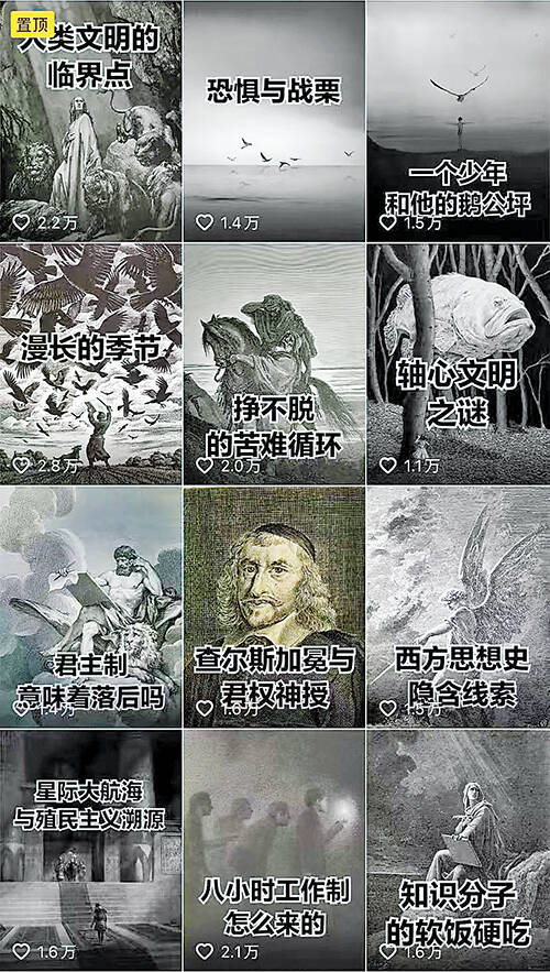点开他的抖音账号“思想史万有引力”,观众仿佛进入了另一个世界:它的主页封面图是一只目光炯炯的猫头鹰——猫头鹰总在黄昏起飞,可以看见白天发生的一切,代表了哲学的省思精神;视频封面是黑白的欧洲中世纪版画,仿佛把观众带回了古老的哲学学院。