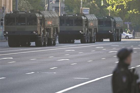 俄罗斯在白俄罗斯部署的核武器中,陆基核力量是“伊斯坎德尔”导弹系统。图为一列伊斯坎德尔-M导弹发射器在莫斯科向红场行进,参加胜利日阅兵式(资料图) 视觉中国供图