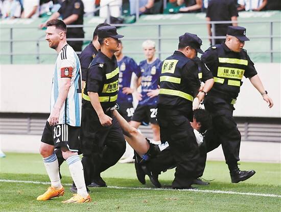 15日晚在北京工人体育场进行的阿根廷和澳大利亚的比赛中,一位球迷从看台上攀爬跳下,冲到梅西身边拥抱合影,再避开保安的追赶,绕着球场跑了快一圈,甚至还和阿根廷门将马丁内斯击了个掌。最后他力竭躺倒,被六名保安拎出场时,脸上还挂着忘我的笑容。