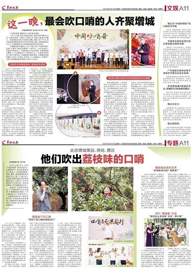6月17日上午增城清一色生态果园非常热闹。口哨达人现场展示口哨技艺,吸引了到场的游客、短视频达人关注。哨友唐进强模仿小鸟、小鸡等动物的叫声,吸引不少人拿出手机拍摄。他说:“在荔枝园吹口哨,接地气!希望通过我的展示,让更多人意识到在大自然吹口哨、展示口技,是件快乐的事。”