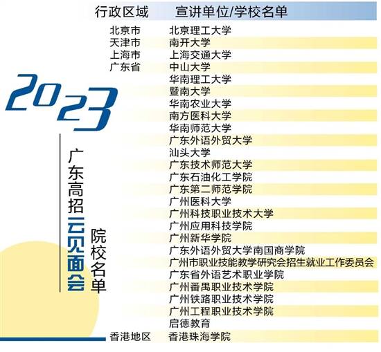 2023广东高招云见面会的更多信息请持续关注羊城晚报新闻客户端羊城派、微信公众号“羊城晚报学大大”,最新信息将在第一时间更新分享。6月27日,近30所学校的招生官将带着最权威、最全面的干货在直播间等候广大高考考生,期待与大家不见不散!