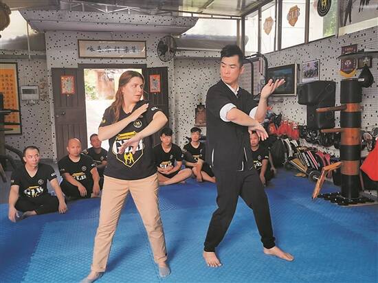 鹤山古劳咏春传承人冯家辉(右)教授洋弟子 通讯员 朱强 谭耀广 供图
