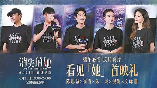 6月19日晚,悬疑犯罪电影《消失的她》在北京举行首映礼,监制、编剧陈思诚,导演崔睿,领衔主演朱一龙、倪妮、文咏珊,主演黄子琪出席亮相,分享幕后创作故事。该片于6月21日18点起开启超前点映,6月22日正式上映。