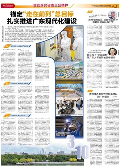 锚定“走在前列”总目标,广东要有一往无前的豪情。“在全面深化改革、扩大高水平对外开放、提升科技自立自强能力、建设现代化产业体系、促进城乡区域协调发展等方面继续走在全国前列,在推进中国式现代化建设中走在前列”,已清晰指明新征程广东的着力点、突破点,方向、目标、路径更加清晰,前进的道路豁然开朗。“走在前列”呼唤新担当新作为,我们要以“再造一个新广东”的闯劲干劲拼劲再出发,摒弃守的心态、振奋创的精神,在继往开来中再闯新路,在苦干实干中再创新业,在攻坚克难中再开新局,以走在前列的奋斗与业绩,努力创造让世界刮目相看的新的更大奇迹。