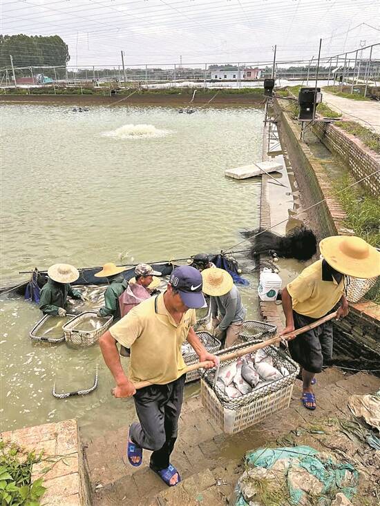 6月21日,在茂南三高渔业发展有限公司基地,阳光柔和地铺洒在波光粼粼的池塘水面上,鱼塘中的增氧机激起的水花“哗哗”作响,成群结队的罗非鱼在水里不停游动。