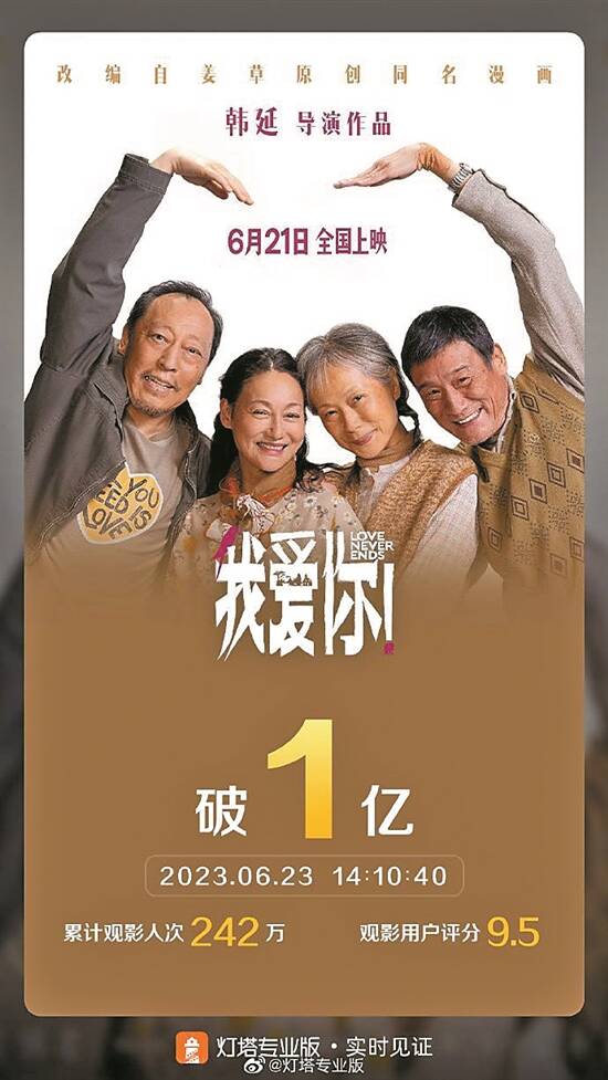 位列2023年端午档票房榜第二位的《我爱你!》,由韩延执导,倪大红、惠英红、梁家辉、叶童主演,聚焦老年爱情故事。影片6月21日上映,截至6月22日14时10分,累计总票房破亿,打破过去三年端午档爱情片单日票房、档期票房等纪录。