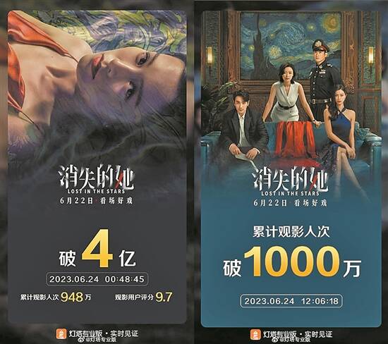 朱一龙、倪妮、文咏珊主演的悬疑电影《消失的她》表现抢眼,截至6月24日0时48分,该片累计票房达4亿元,打破中国影史端午档悬疑片、犯罪片档期票房等纪录。该片6月22日开映,连续两天单日票房破1.5亿元,端午档档期内票房也已达到3.74亿元,票房比位居第二位的《我爱你!》多出近3亿元,优势巨大。目前,《消失的她》票房还在持续增长中,该片已无悬念坐稳2023端午档票房榜冠军宝座。