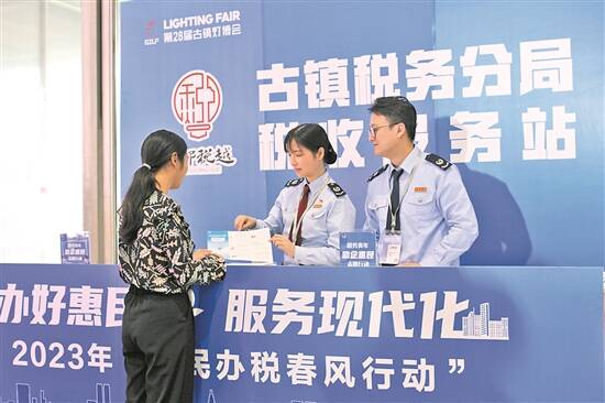 第28届中国·古镇国际灯饰博览会上,税务青年在“税费服务站”为往来客商提供涉税费咨询服务
