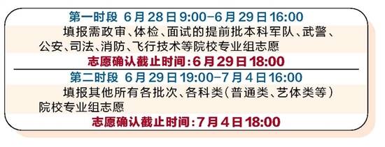 志愿填报分两个时段进行,第一时段为6月28日9:00-6月29日16:00。本时段仅填报需政审、体检、面试的提前批本科军队、武警、公安、司法、消防、飞行技术等院校专业组志愿,报考上述院校专业组志愿的考生须在本时段填报并网上确认志愿信息。其他志愿在第二时段填报,时间为6月29日19:00-7月4日16:00。除第一时段填报的院校专业组志愿外的其他所有各批次、各科类(普通类、艺体类等)院校专业组志愿,均须在本时段填报并网上确认志愿信息。