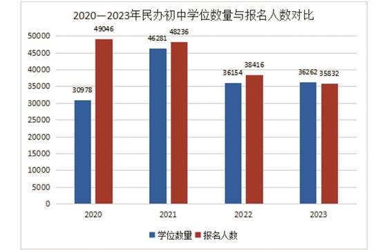 2020-2023年,民办初中报名人数与招生学位数量对比:2020年,49046人报名竞争30978个学位;2021年,48236人竞争46281个学位;2022年,报名人数和学位数双双“断崖式”下跌,前者减少9820人至38416人,后者减少10127个至36154个,不过依然是前者多于后者;到了今年,35832名学生报名,学位共36262个,多出430个学位。