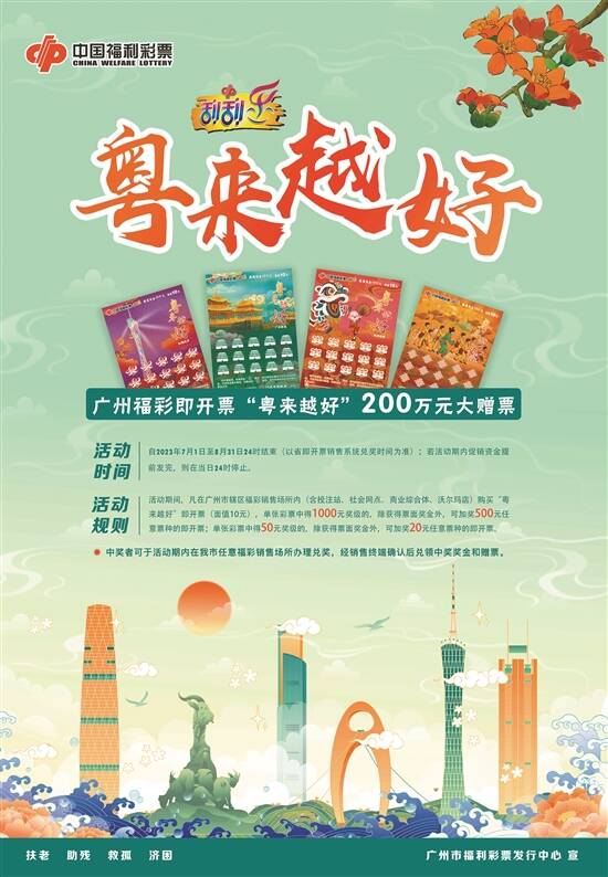 近日,广州市福利彩票发行中心发布公告,自7月1日起在全市范围内开展“粤来越好”即开票200万元大赠票活动,针对“粤来越好”即开票的两个奖级开展赠票。
