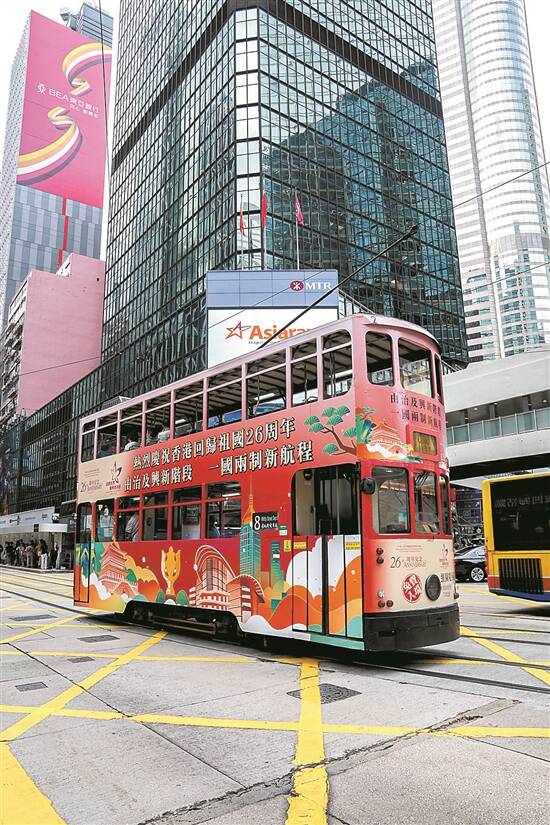 6月29日,印有庆祝香港回归祖国26周年的字样的叮叮车穿梭在马路上